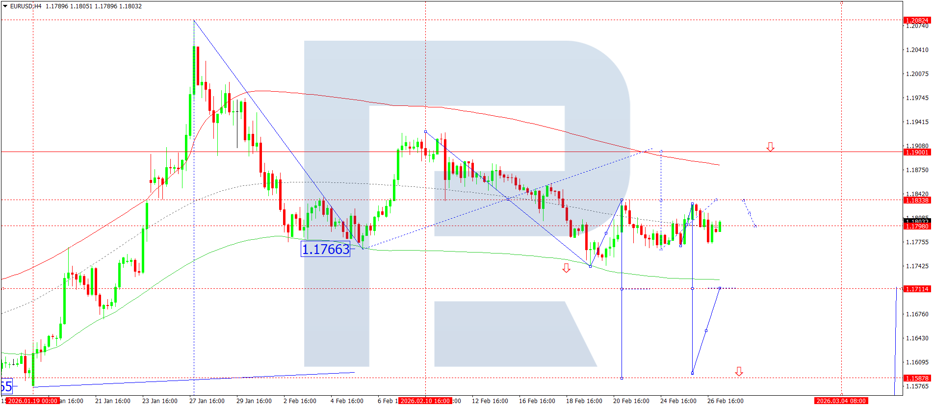En el gráfico H4 del par EURUSD, el mercado rompió por debajo de 1.1818 y completó una onda de caída hasta 1.1777. Hoy, 27 de febrero de 2026, la onda de crecimiento hacia 1.1833 continúa desarrollándose. A continuación, se espera una caída hasta 1.1798. En la práctica, el mercado delineará los límites del rango de consolidación. En caso de una ruptura al alza, se considerará la probabilidad de extender la corrección hasta 1.1900. Una ruptura a la baja abrirá el potencial para una onda de caída hacia 1.1745, con perspectivas de extender la tendencia hasta 1.1650. El objetivo es local.