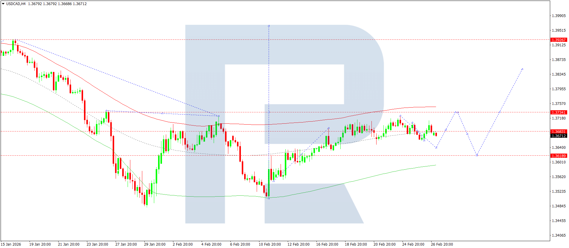 En el gráfico H4 del par USDCAD, el mercado está formando un rango de consolidación alrededor de 1.3686. Hoy, 27 de febrero de 2026, una caída hasta 1.3640 sigue siendo relevante. Luego se espera crecimiento hacia 1.3706, y si este nivel se rompe, se abrirá el potencial para una onda de crecimiento hacia 1.3737.