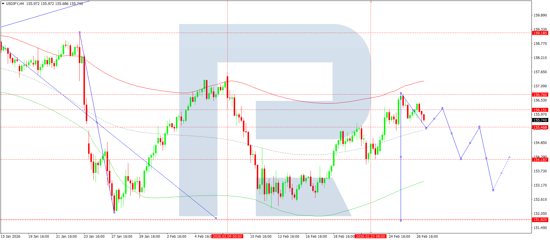 En el gráfico H4 del par USDJPY, el mercado está formando un rango de consolidación alrededor de 156.10. Hoy, 27 de febrero de 2026, no se descarta la continuación de la onda de caída hasta 155.45. Más adelante, se considerará la probabilidad de desarrollar una onda de crecimiento hacia 156.10.