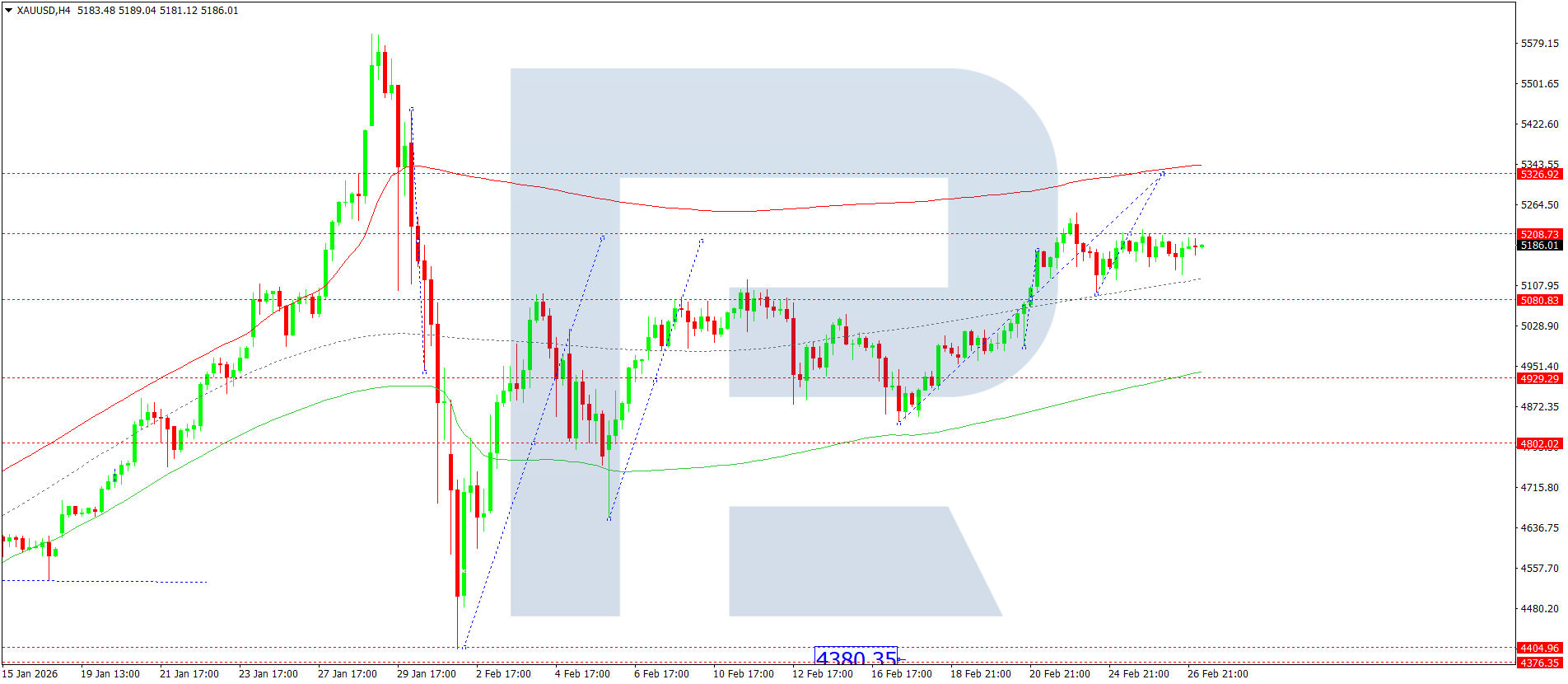 En el gráfico H4 de XAUUSD, el mercado está formando una onda de crecimiento hacia 5,326. Hoy, 27 de febrero de 2026, se espera que se alcance este nivel objetivo. Más adelante, se considerará la probabilidad del inicio de una onda de caída hacia 5,080. Si este nivel se rompe, se abrirá el potencial para una onda hacia 4,930.