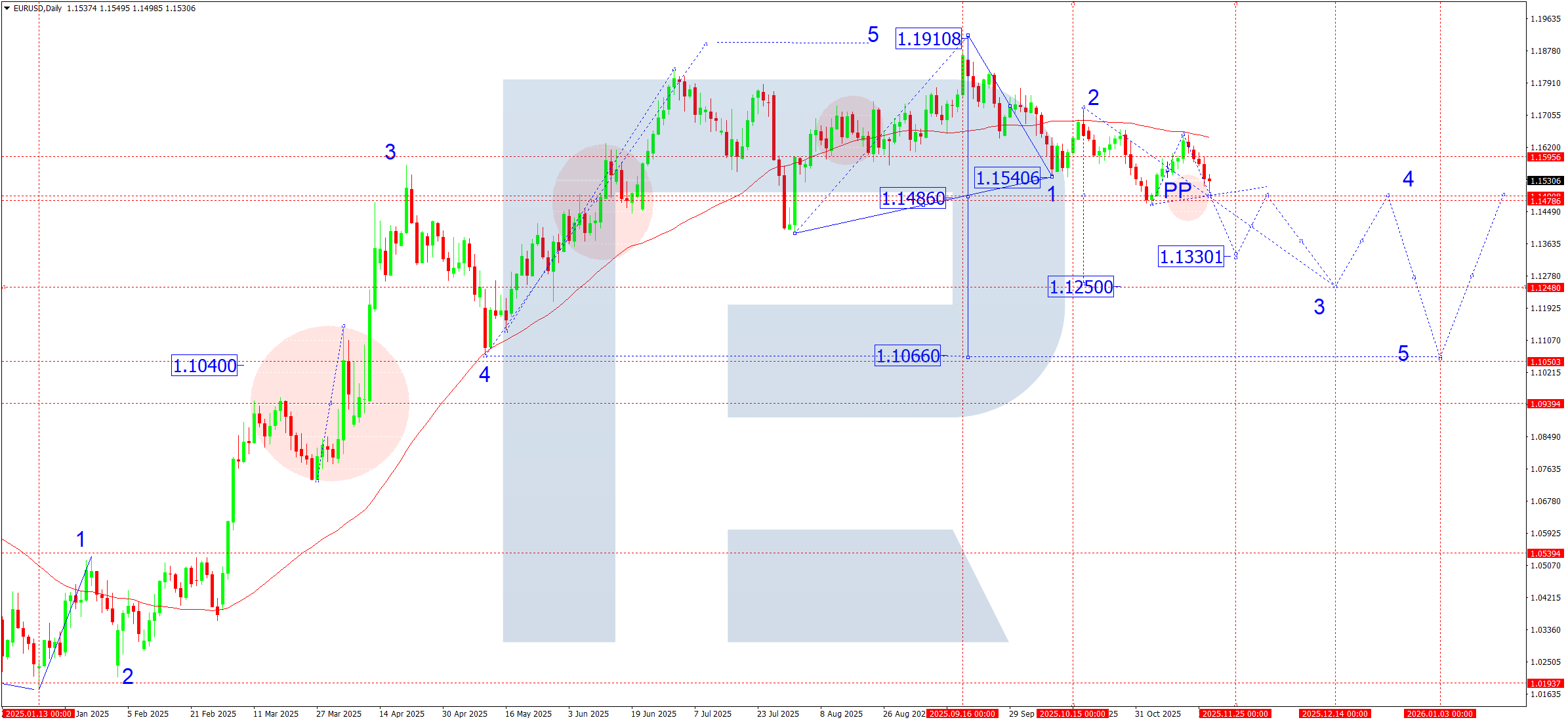 En el gráfico diario, el par EURUSD ha completado una estructura correctiva hacia 1.1655 y ahora está formando la tercera onda bajista. Actualmente, el primer movimiento bajista terminó, con el precio avanzando a la baja hasta 1.1499, que actúa como posible punto de pivote. En la próxima semana, se espera que se forme un rango de consolidación local por encima de 1.1499. Si el rango rompe al alza, la estructura puede extenderse en una pierna correctiva hasta 1.1570 (prueba desde abajo). Si el rango rompe a la baja, esto abrirá potencial para un mayor descenso dentro de la tercera onda, con objetivos en:
