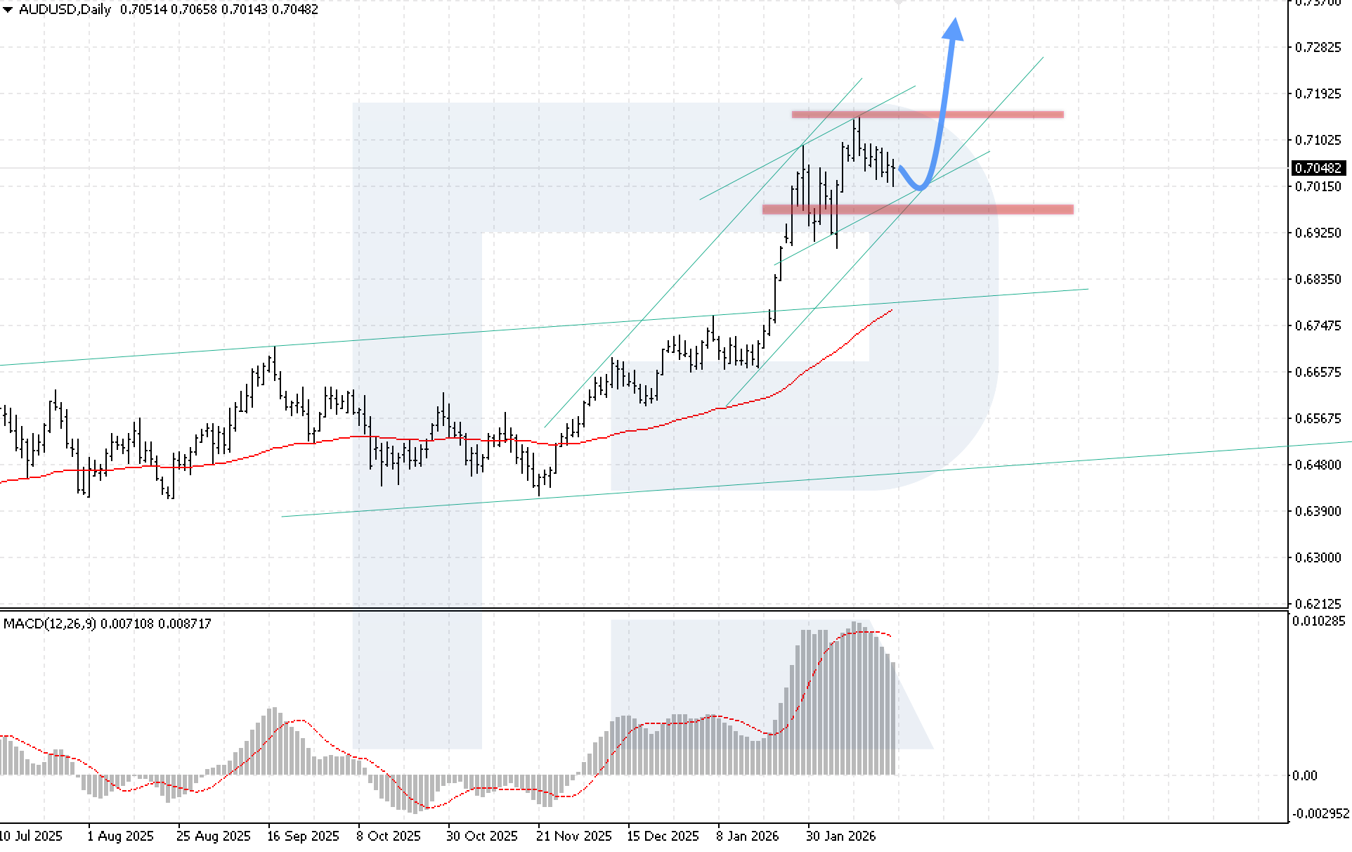 Bullish scenario (baseline): un rebote desde el límite inferior del canal alcista en los niveles actuales indicaría la continuidad del movimiento al alza hacia 0.7345, mientras que una ruptura por encima de la resistencia local solo reforzaría este escenario.