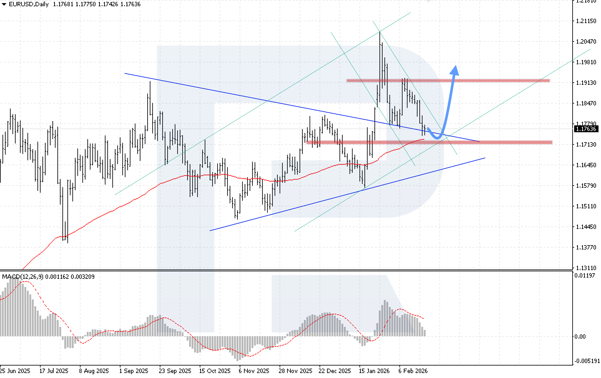 El MACD apunta a una fase de consolidación. El histograma continúa cayendo, reflejando una desaceleración del impulso y se ha acercado casi a la línea cero, lo que sugiere un equilibrio de fuerzas entre compradores y vendedores. Una condición clave para el escenario alcista esta semana es la consolidación por encima de 1.1825. Esto confirmaría una ruptura por encima del límite superior del canal correctivo descendente y abriría la puerta a una recuperación adicional.