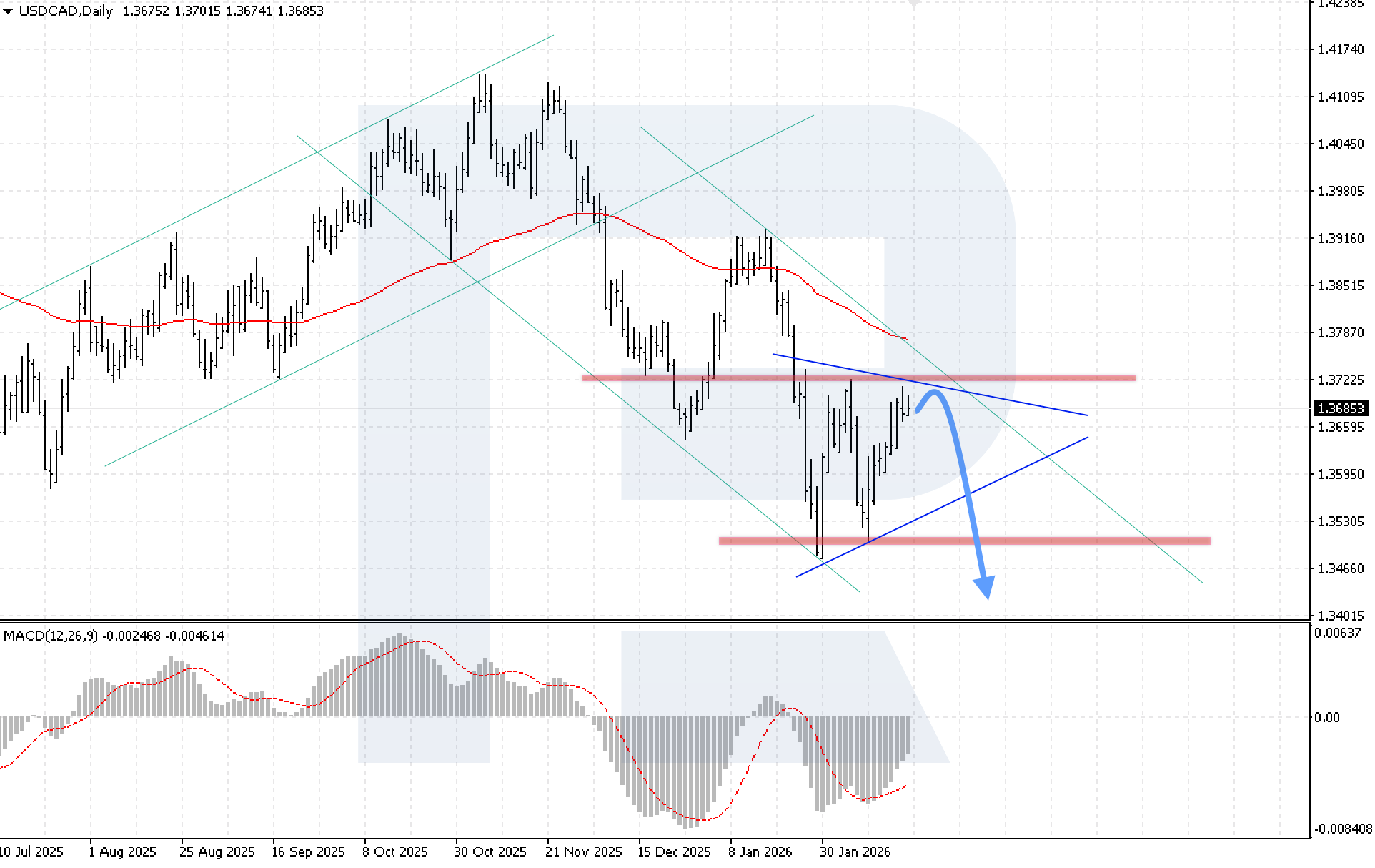Bearish scenario (alternative): una ruptura por debajo del soporte con consolidación por debajo de 0.6905 señalaría una corrección bajista en el par y podría indicar un patrón de reversión con perspectiva de caídas adicionales hacia objetivos más profundos.
