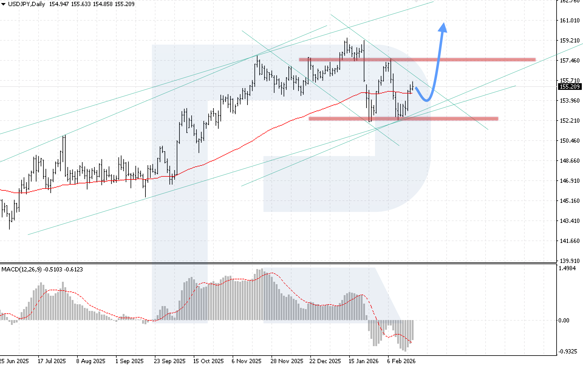 El MACD confirma señales de reversión: el histograma sube activamente y la línea de señal ha salido del área del histograma, indicando un impulso alcista renovado. Una condición clave para confirmar el escenario alcista esta semana es la consolidación por encima de la resistencia 156.15, lo que señalaría una ruptura por encima del límite superior del canal descendente.