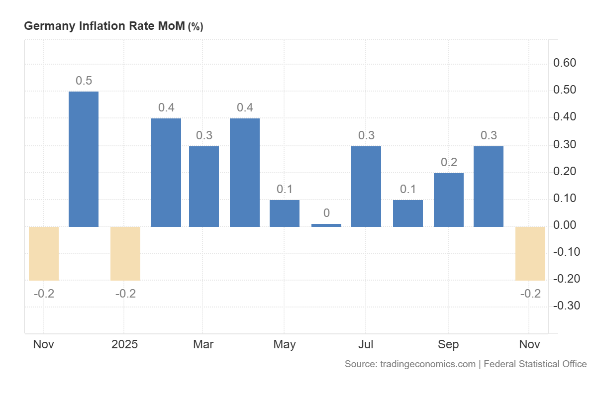 Alemania registró una variación mensual del IPC de -0.2% m/m. La cifra coincidió con las expectativas del mercado (-0.2%), pero fue significativamente inferior a la lectura anterior (+0.3%). En términos prácticos, esto indica una caída a corto plazo de los precios al consumidor y una relajación de las presiones inflacionarias en comparación con el mes previo. Para el mercado bursátil alemán, el principal canal de transmisión son las expectativas sobre los tipos de interés y los rendimientos de los bonos. Una inflación más baja generalmente reduce la probabilidad de que la zona euro necesite mantener tipos de interés elevados durante un período prolongado.