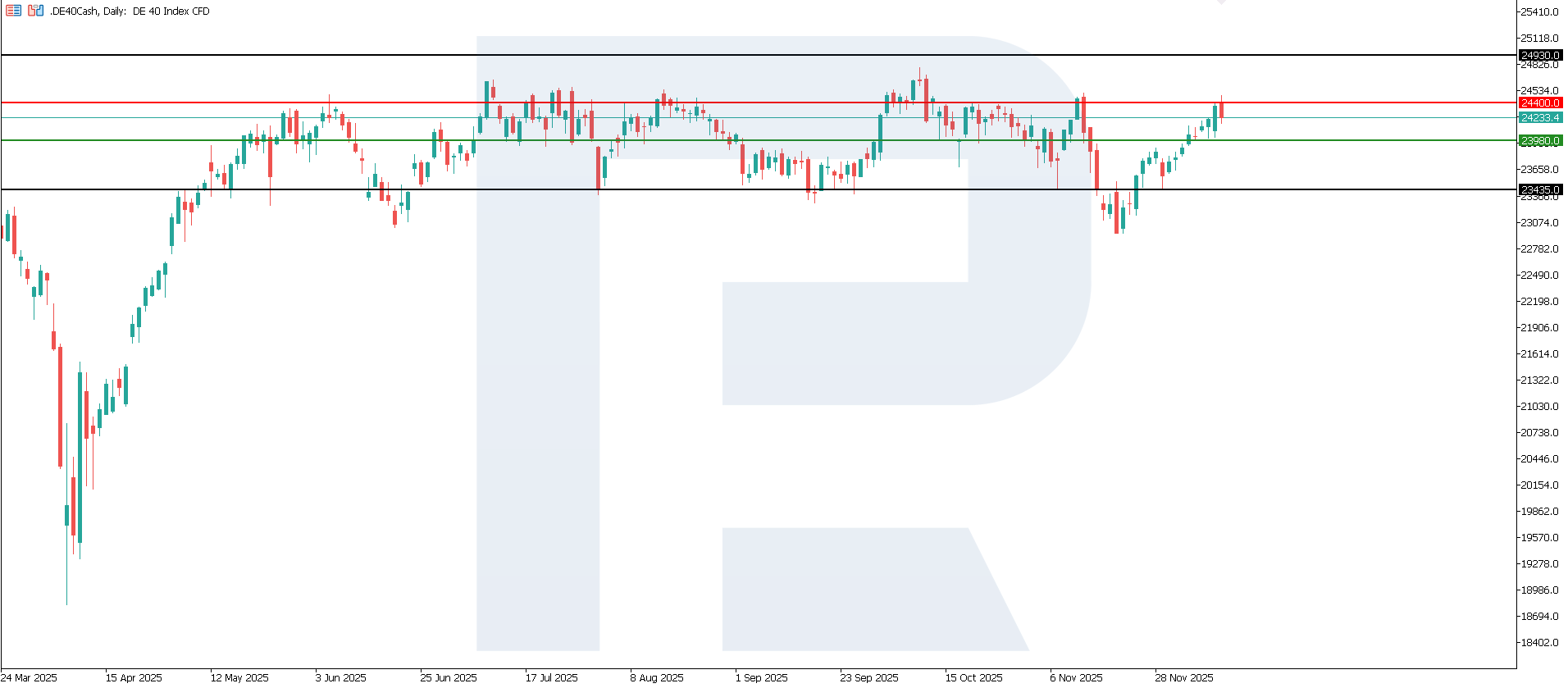 Al analizar el DE 40, es importante señalar que muchos de los componentes del índice generan una parte sustancial de sus ingresos fuera de Alemania. Como resultado, el índice suele reaccionar no solo a los datos internos, sino también a los desarrollos económicos más amplios en Europa y a nivel global. Cuando la inflación se modera, los mercados ganan confianza en que los tipos de interés de la zona euro podrían ser más bajos de lo previsto anteriormente. En estas condiciones, el euro suele debilitarse, lo que proporciona un apoyo adicional al DE 40 en comparación con índices más dependientes del consumo interno y la demanda doméstica.