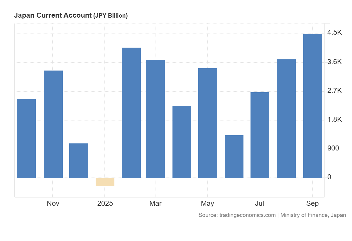 El superávit por cuenta corriente de Japón alcanzó los 4.483 billones de JPY, muy por encima tanto del pronóstico de 2.468 billones de JPY como del valor anterior de 3.701 billones de JPY. Esto indica que la entrada de ingresos del extranjero —exportaciones menos importaciones más los retornos de inversión exterior— fue más fuerte de lo esperado. Es una señal positiva para la economía: el balance externo se mantiene estable y el país obtiene mayores ingresos del comercio exterior y de las inversiones internacionales.