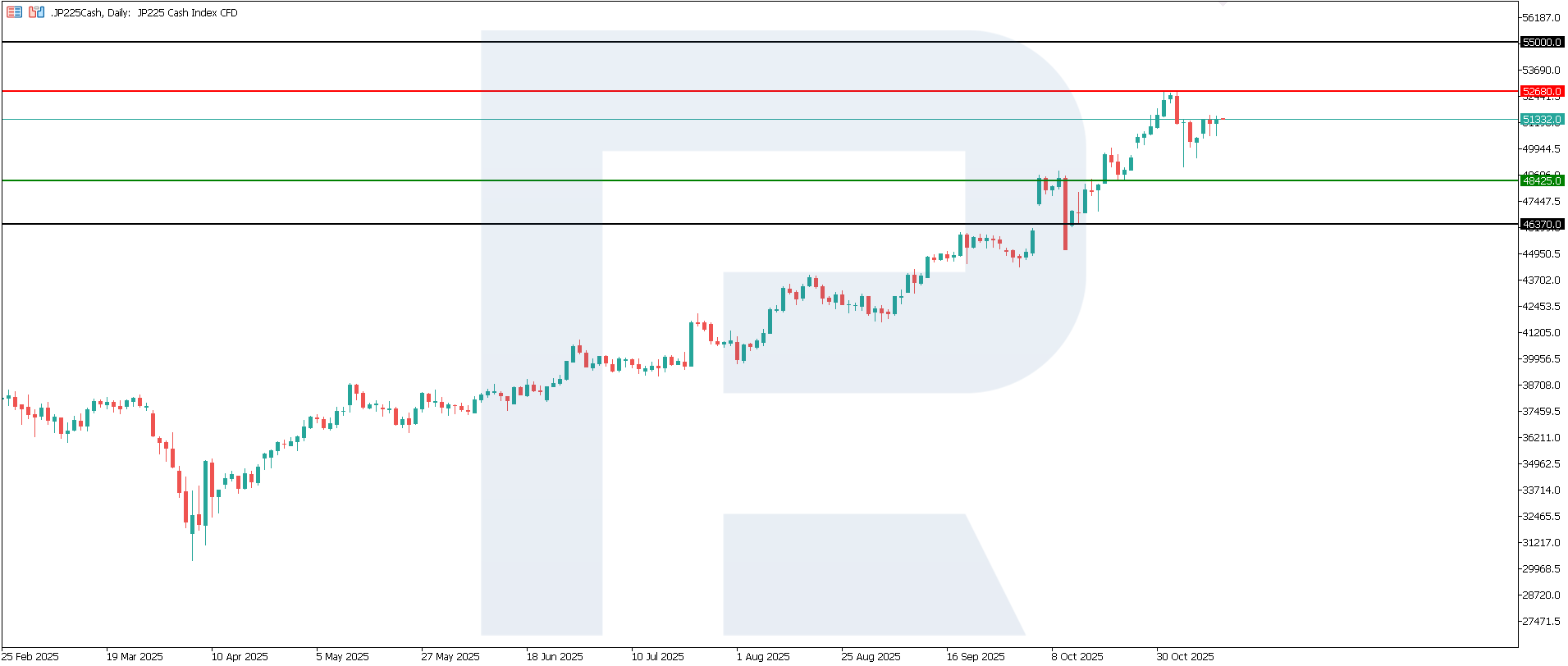 Para el índice JP 225, que incluye una gran proporción de empresas orientadas a la exportación, la reacción base es moderadamente positiva. Es probable que ocurra una rotación dentro del índice: los fabricantes de automóviles y las empresas electrónicas podrían mostrar un rendimiento inferior, mientras que las compañías orientadas al mercado interno —que se benefician de importaciones más baratas y condiciones financieras estables— probablemente muestren mayor resiliencia. La magnitud del movimiento futuro dependerá de cómo el mercado interprete la composición del superávit por cuenta corriente. El próximo objetivo al alza para el JP 225 se sitúa en 55,000.0.
