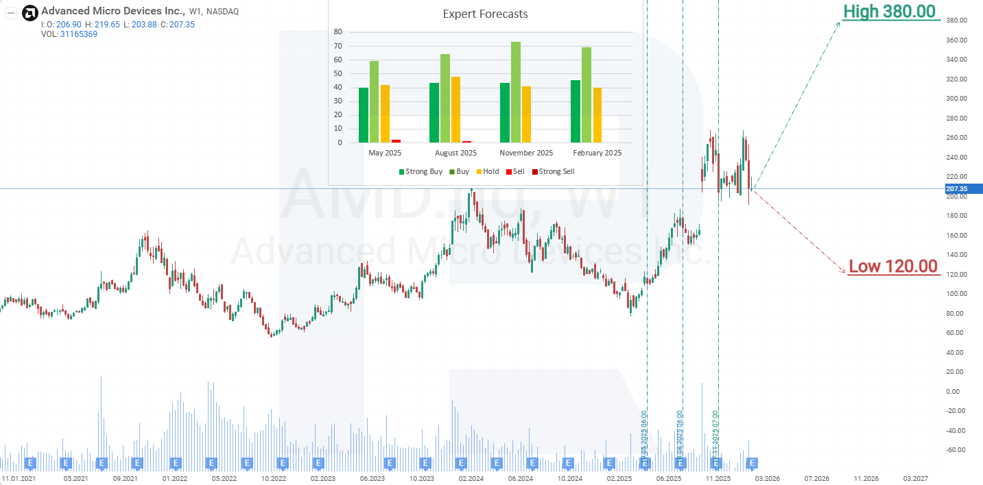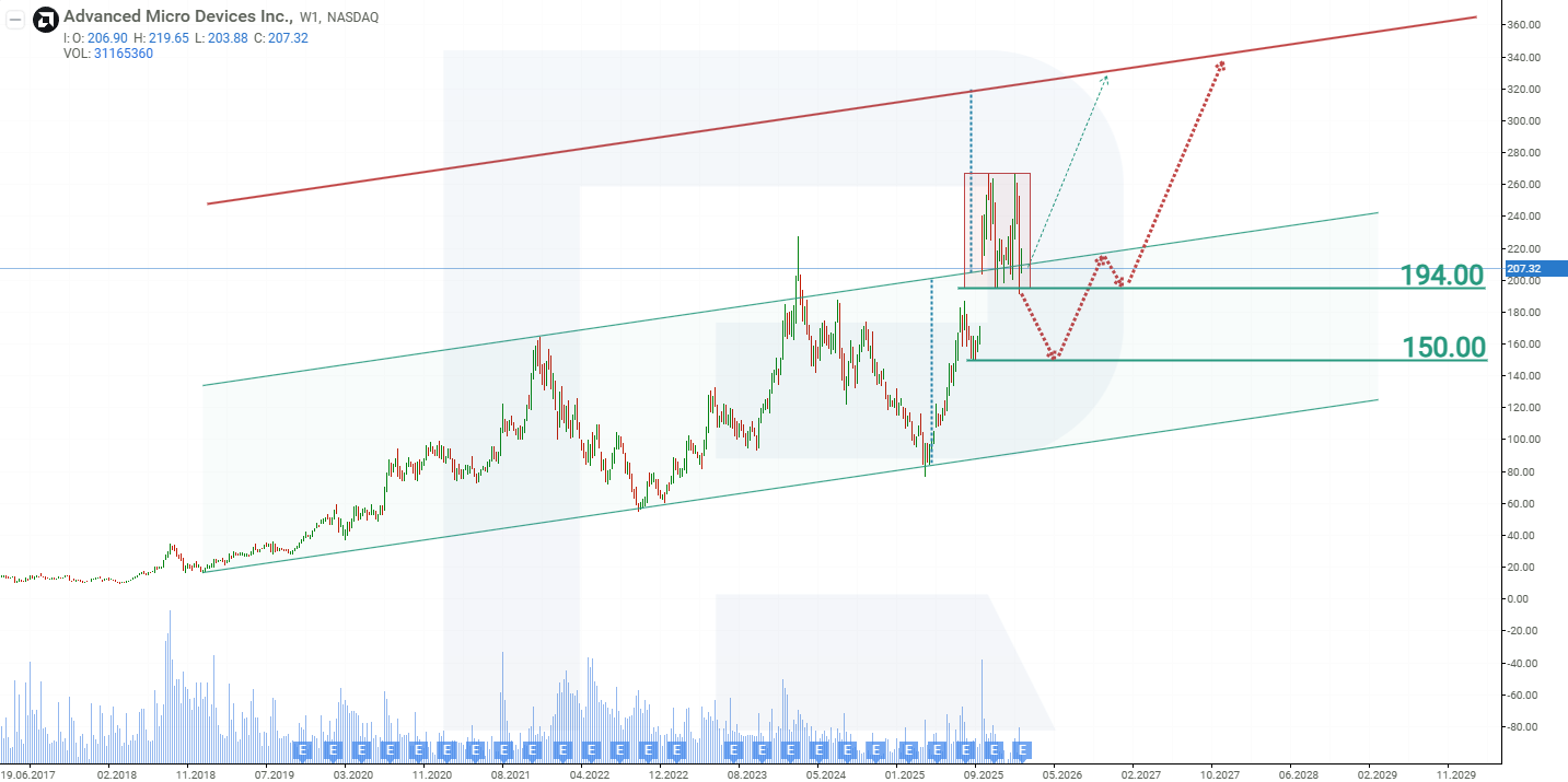 En el gráfico semanal, las acciones de Advanced Micro Devices se negociaron dentro de un canal ascendente hasta octubre de 2025. El 6 de octubre de 2025, un acuerdo importante entre AMD y OpenAI para suministrar chips de IA, junto con una opción para que OpenAI adquiera hasta el 10% de las acciones de AMD, provocó un fuerte aumento en el precio de la acción de AMD, causando que se rompiera el límite superior del canal ascendente. Sin embargo, luego el crecimiento del precio de la acción se estancó, formando un doble techo en el gráfico, lo que señala una posible caída del precio. Basándose en la dinámica actual del precio de las acciones de AMD, los escenarios posibles para 2026 son los siguientes: