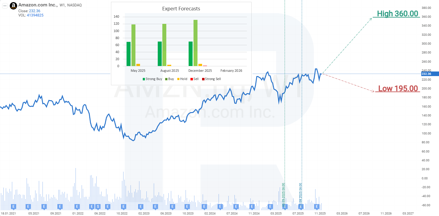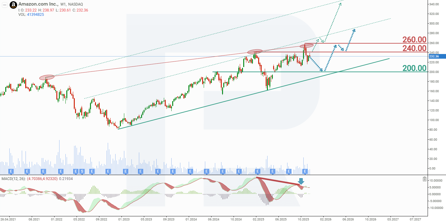 En el gráfico semanal, las acciones de Amazon.com (AMZN) continúan cotizando dentro de un canal de tendencia alcista. Tras la publicación del informe de Q3 2025, la acción alcanzó un nuevo máximo histórico cerca de 260 USD antes de entrar en una fase correctiva. También se ha formado una divergencia en el gráfico, reforzando la señal de una posible corrección del precio. Basándose en el desempeño actual del precio de las acciones de Amazon.com, los posibles escenarios para 2026 son los siguientes: