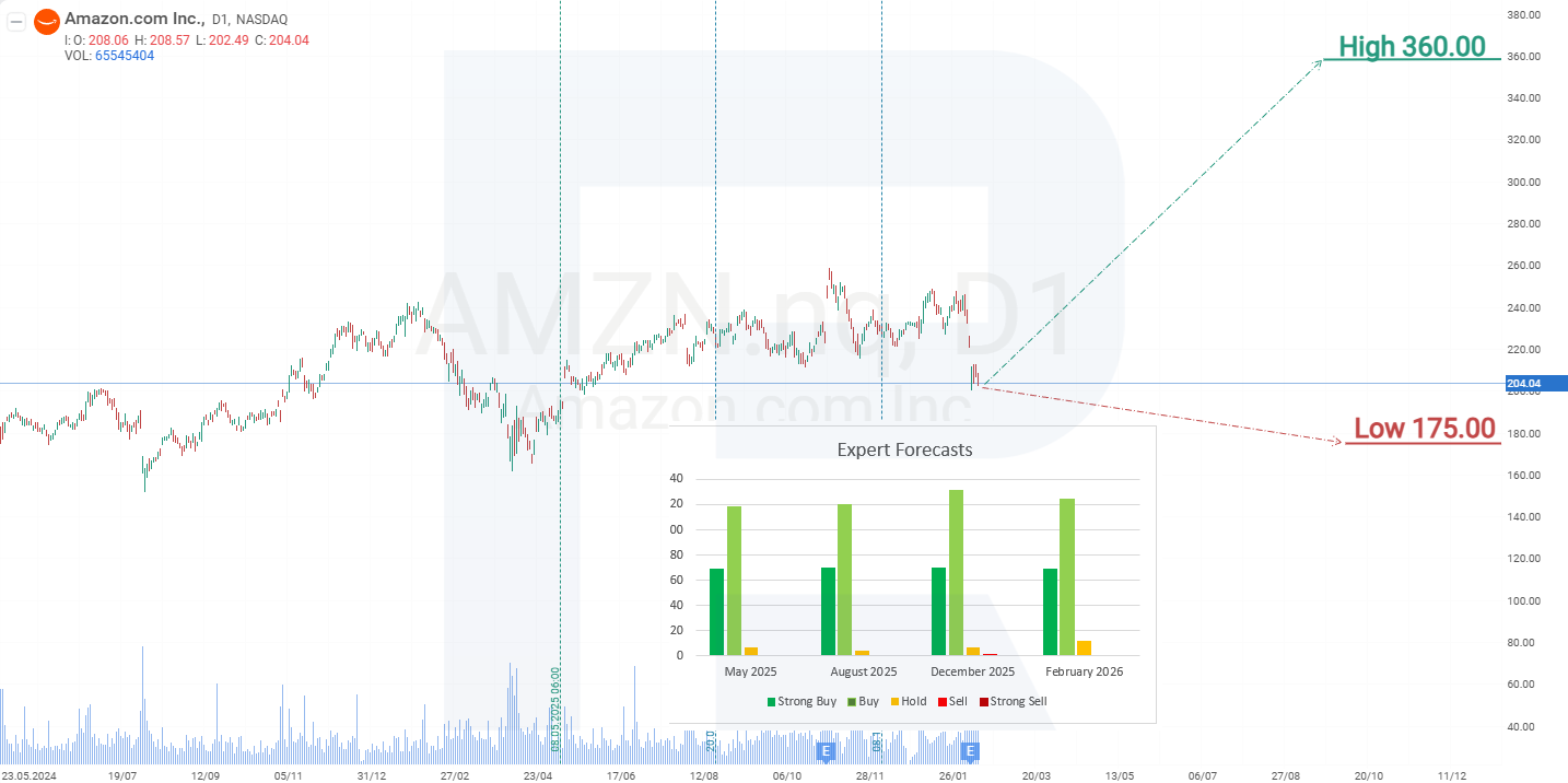 La previsión base para las acciones de AMZN sugiere una prueba del soporte en 190 USD, seguida de un rebote y una reanudación del crecimiento dentro del canal ascendente. El primer objetivo alcista sería el nivel de resistencia de 260 USD. Si este nivel se rompe, el siguiente objetivo sería el límite superior del canal en 290 USD.