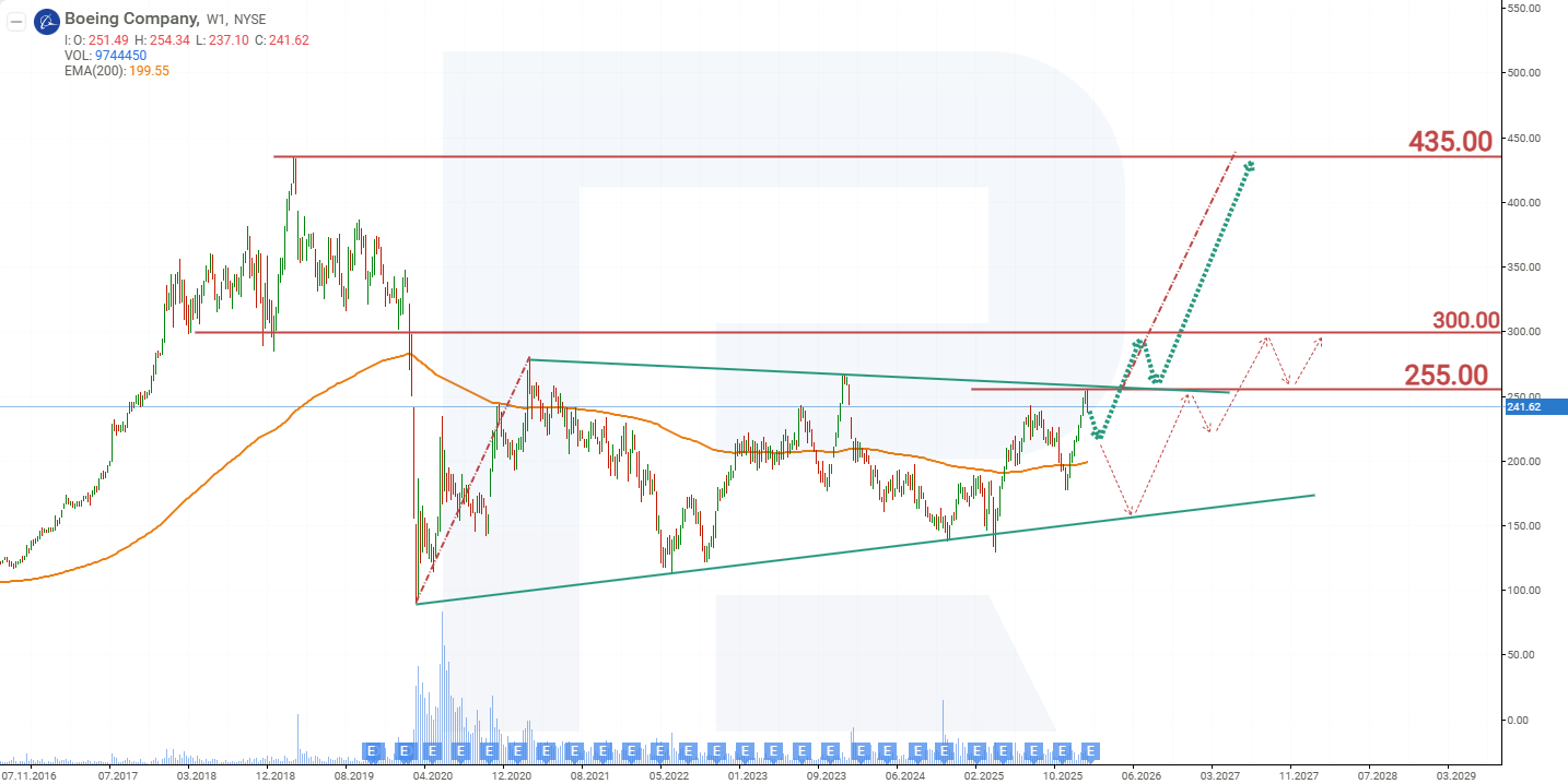 El pronóstico del escenario base para las acciones de BA sugiere una ruptura por encima del nivel de resistencia de 255 USD, señalando una ruptura por encima del límite superior del Triángulo. En este caso, se espera un crecimiento adicional del precio hacia un objetivo de 435 USD.
