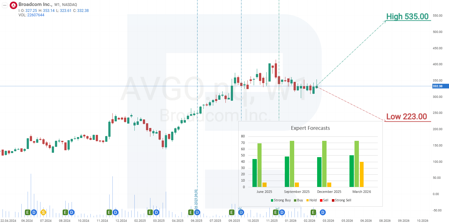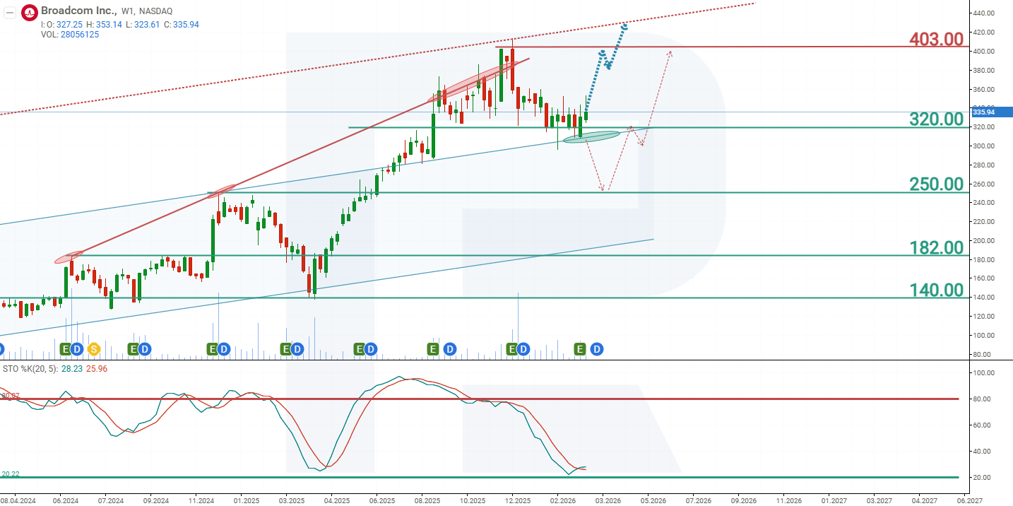 A marzo de 2026, las acciones cotizan cerca del soporte en 320 USD. El indicador Stochastic se aproxima a la zona de sobreventa, lo que sugiere que la corrección puede estar cerca de completarse. Cabe destacar que, en abril de 2025, cuando comenzó el fuerte movimiento alcista, el indicador Stochastic se encontraba en un nivel similar al de su lectura actual, lo que puede señalar que la corrección actual se acerca a su fin. Basándose en la dinámica predominante del precio en las acciones de Broadcom, los posibles escenarios de precio para AVGO en 2026 son los siguientes: