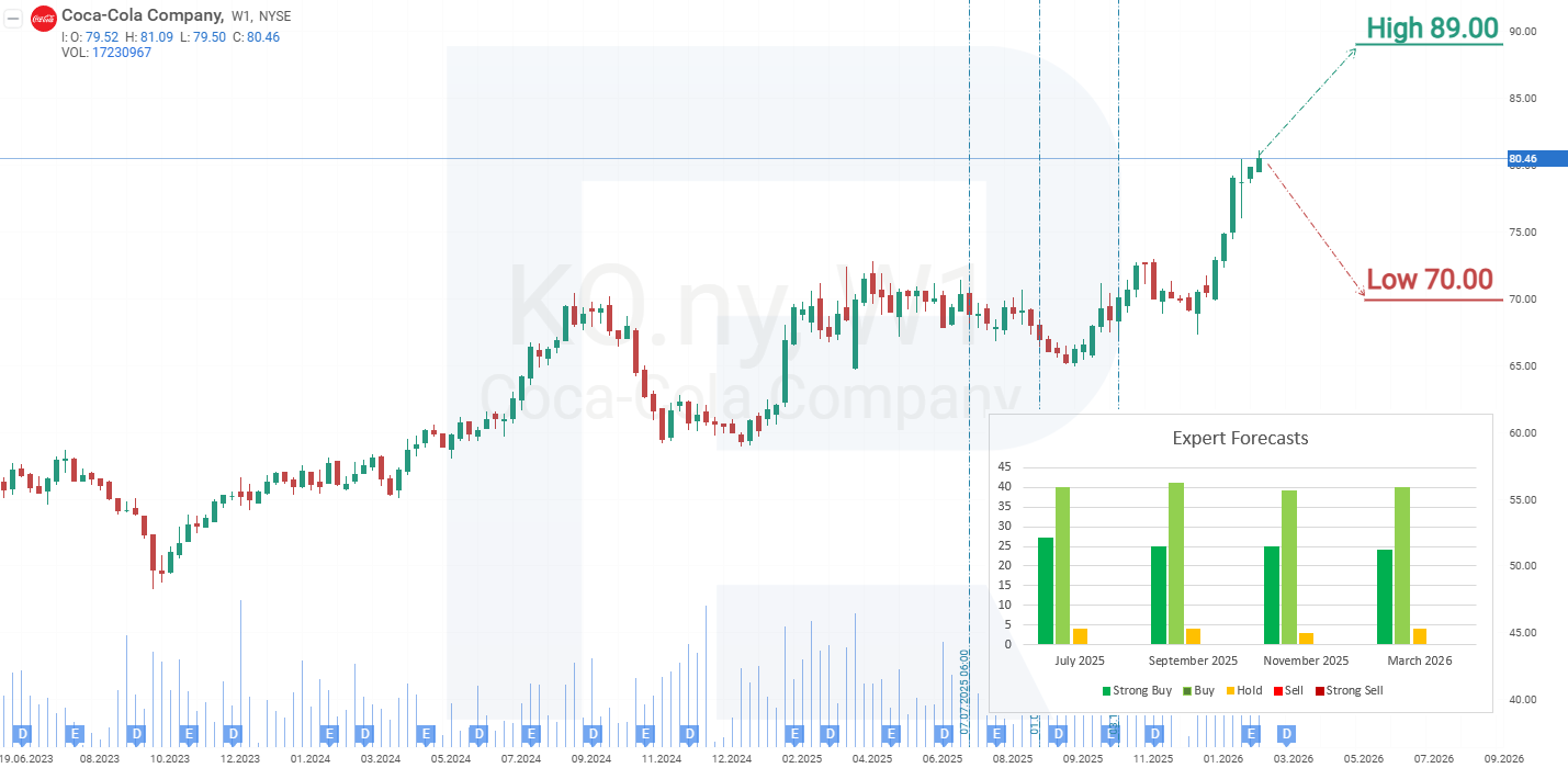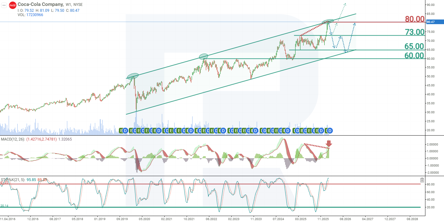 La previsión optimista para las acciones de Coca-Cola sugiere una prueba del soporte en 73 USD, seguida de un rebote. En este escenario, las acciones de KO podrían superar la resistencia de 80 USD y continuar subiendo hacia 100 USD por acción.