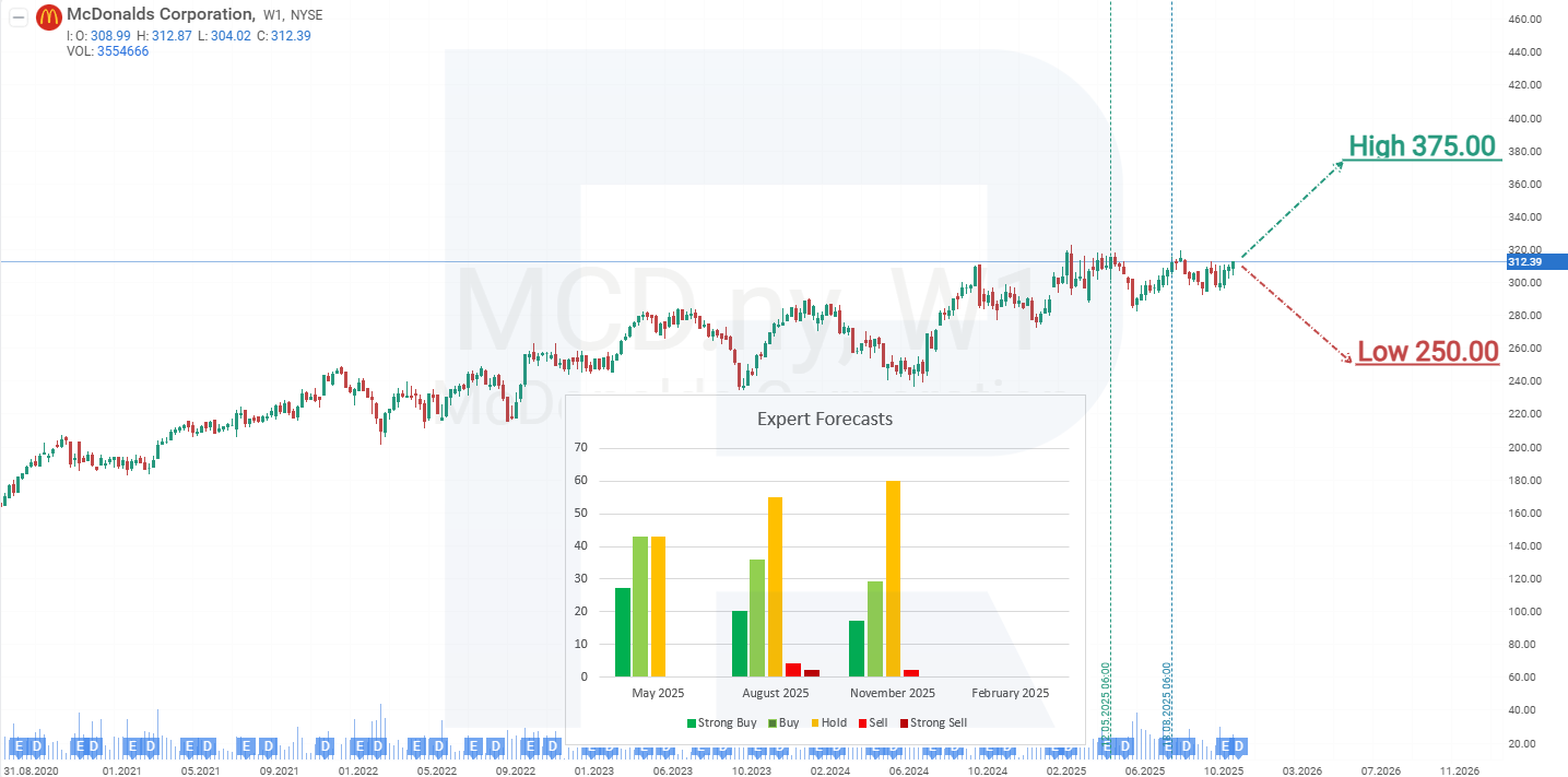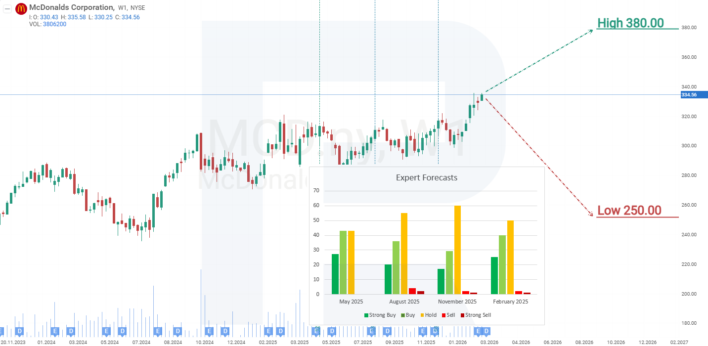 En el gráfico semanal, las acciones de McDonald's cotizan dentro de un canal alcista y se acercan por tercera vez a su máximo histórico, en torno a 320 USD. Dada la sólida posición financiera de la compañía y su probada capacidad para sortear periodos difíciles, existe una alta probabilidad de que el precio supere esta vez su máximo previo. Sobre la base del rendimiento actual de las acciones de McDonald's Corporation, los posibles escenarios de precio para 2025 son los siguientes: