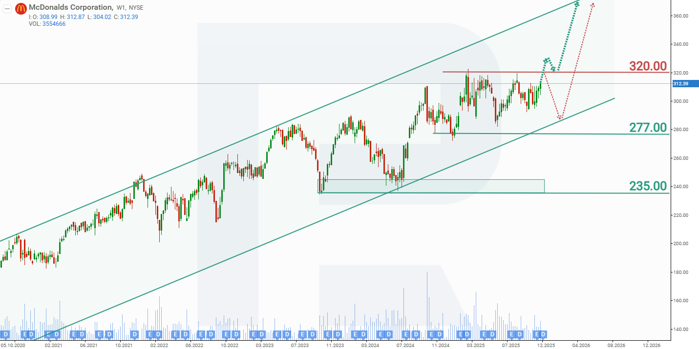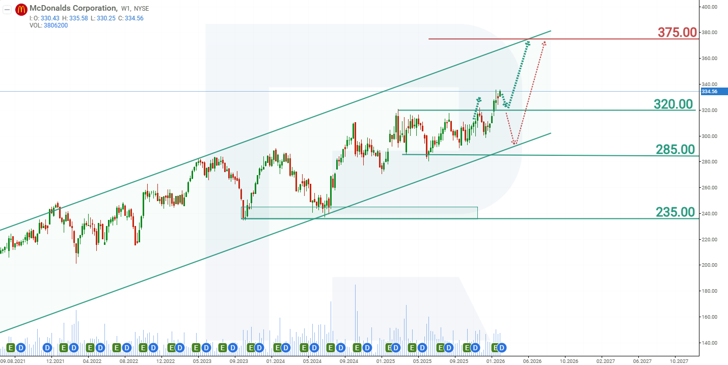 La previsión base para las acciones de McDonald's Corporation anticipa una ruptura al alza por encima de la resistencia en 320 USD, seguida de una subida adicional hacia la frontera superior del canal en 370 USD.