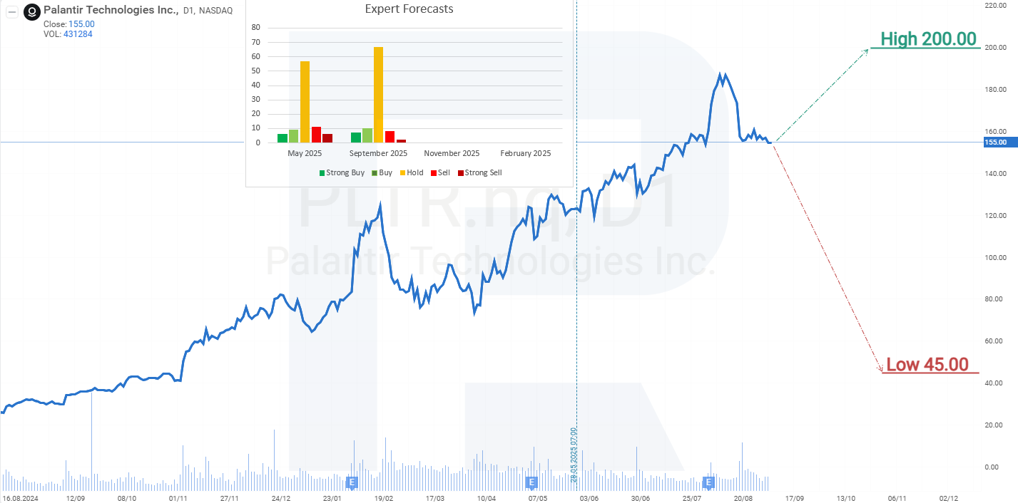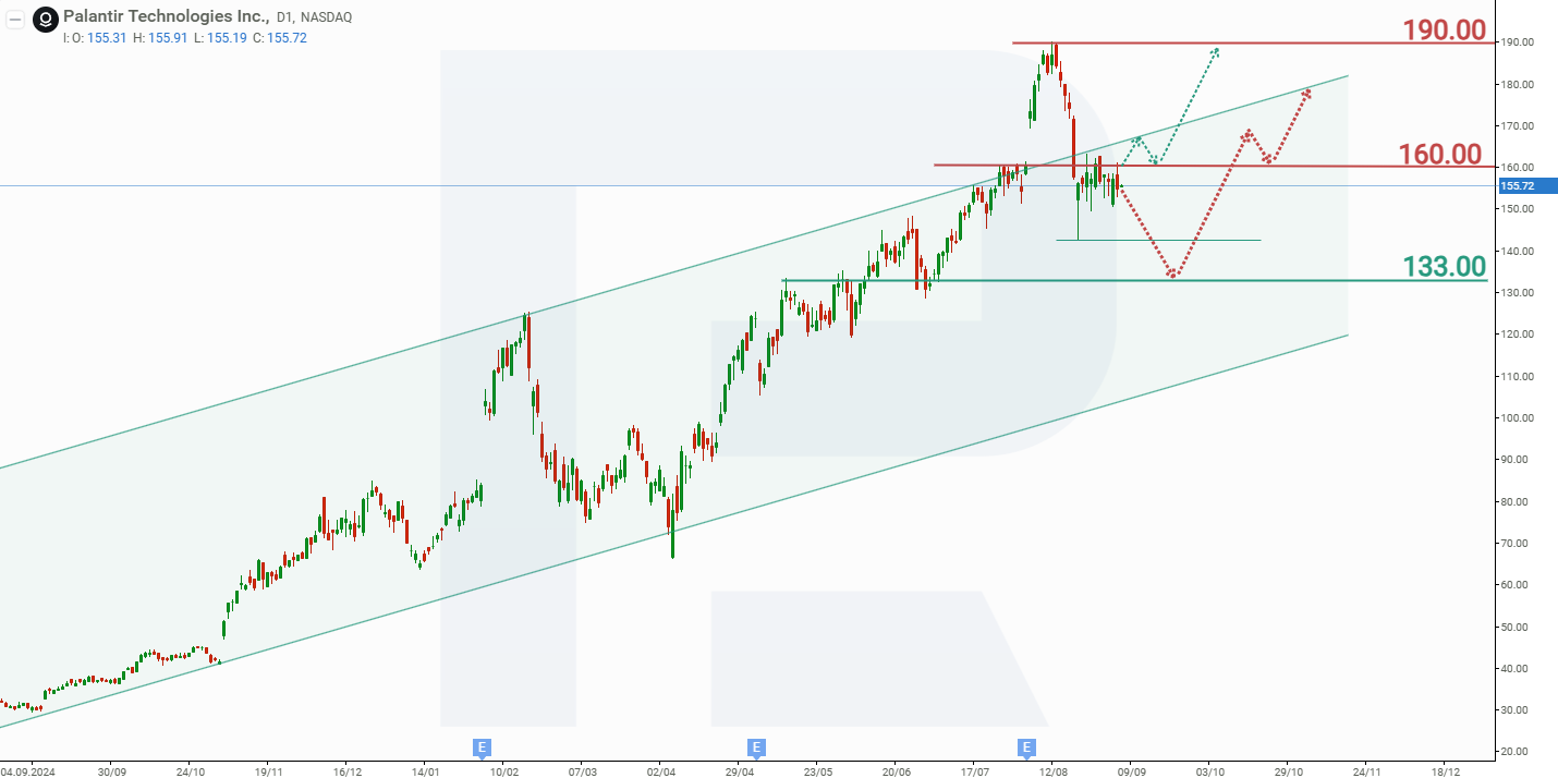 En el gráfico diario, las acciones de Palantir se mantienen dentro de un canal ascendente. La publicación de un sólido informe trimestral provocó una ruptura por encima del límite superior, acelerando las ganancias: el precio subió un 18% en seis sesiones de negociación hasta alcanzar un máximo local de alrededor de 190 USD. Posteriormente, los inversores comenzaron a tomar beneficios, lo que llevó a una corrección y al regreso de las acciones dentro del canal. Con base en la dinámica actual, el panorama de precios para Palantir Technologies en 2025 es el siguiente: