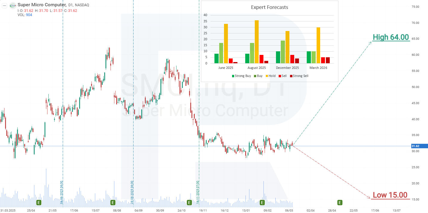 El pronóstico principal para las acciones de Super Micro Computer anticipa una ruptura por debajo del soporte en 27 USD, seguida de una caída hasta 18 USD. En este nivel, se espera que aumente el interés de los inversores por la acción, lo que podría impulsar las acciones de SMCI hasta 40 USD. Una ruptura por encima de esta resistencia podría catalizar nuevas ganancias hacia 66 USD.
