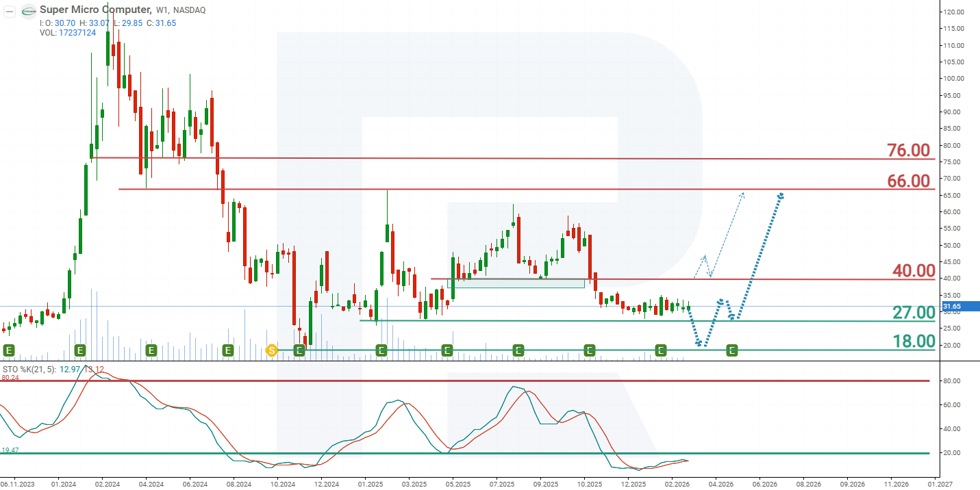 Tras una caída del 85% desde su máximo histórico, las acciones de Super Micro Computer aún no han logrado establecer una tendencia alcista estable. La acción cotiza dentro de un amplio rango de 27 a 60 USD, rompiendo ocasionalmente este rango. Tras la publicación del informe trimestral, no ha habido cambios significativos: las acciones siguen cerca del soporte en 27 USD. El indicador Stochastic se encuentra en zona de sobreventa, pero sus líneas se cruzan desde arriba, lo que sugiere el potencial de otra onda bajista. Basándose en el comportamiento actual de las acciones de Super Micro Computer, los movimientos de precio esperados para SMCI en 2026 son los siguientes: