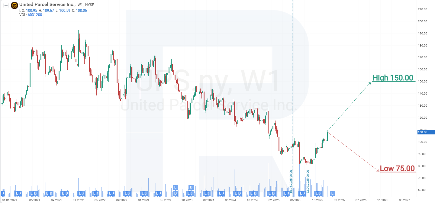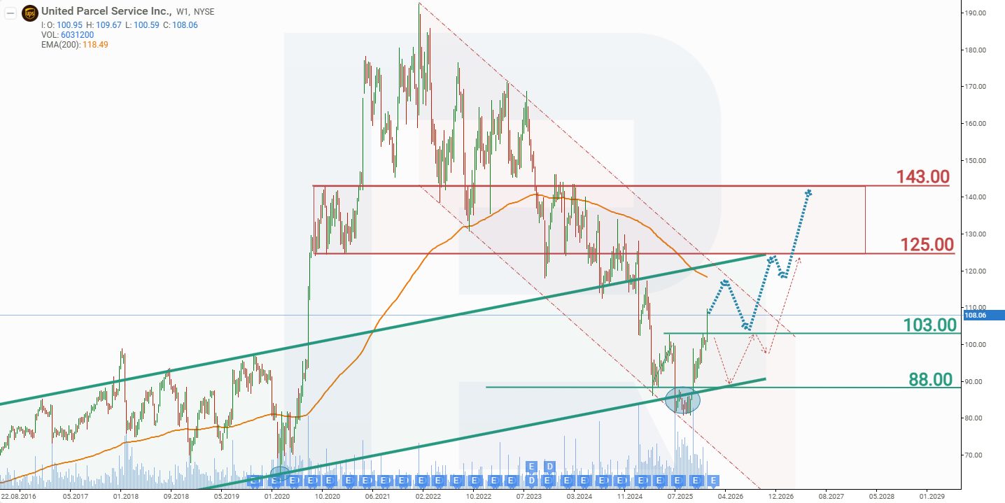La previsión alternativa para las acciones de UPS sugiere una ruptura por debajo del soporte en 103 USD. En este escenario, las acciones de UPS podrían caer hacia 88 USD, desde donde se espera un nuevo avance, con un objetivo alcista en 125 USD.